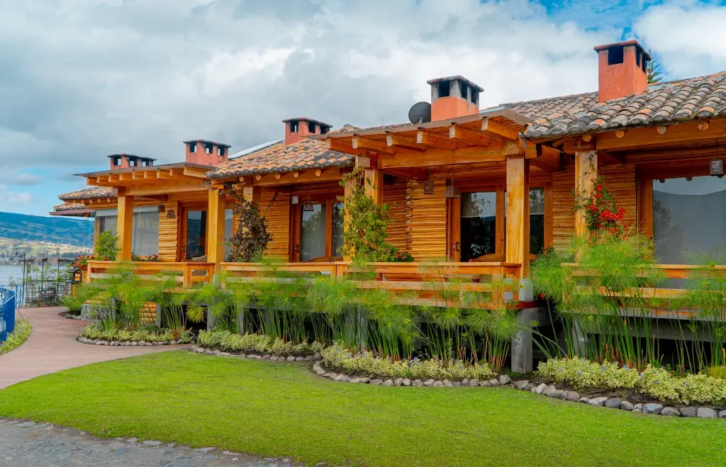 Cabaña familiar de dos pisos con una cálida chimenea y vista al Lago San Pablo.